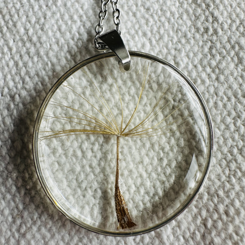 The pendant measures 35mm in diameter and is made of resin, edged with silver and containing a real, desiccated dandelion seed. The chain has a length of 45cm + 5cm extension and is made of silver plated stainless steel.